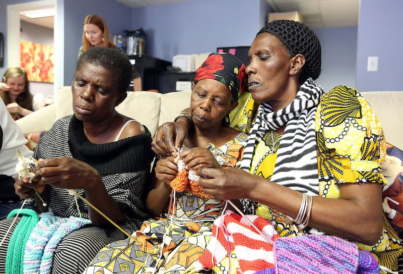 Mifunga Lyonze, Sifora Bamurange and Christine Mukankusi knit at a knitting group meeting for refugee women at the Utah Health and Human Rights office in Salt Lake City, on Tuesday, Oct. 3, 2017. | Kristin Murphy, Deseret News