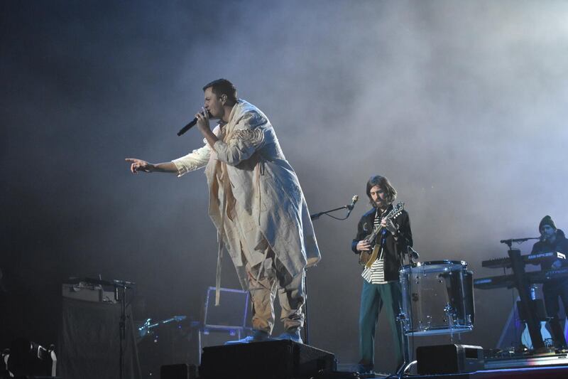 In this new stage setting, the group also played an acoustic-style version of their song “Bleeding Out,” with guitarist Daniel Wayne Sermon playing the electric cello, bassist Ben McKee on the electric string bass and drummer Daniel Platzman on an electric viola shaped like an electric guitar.
