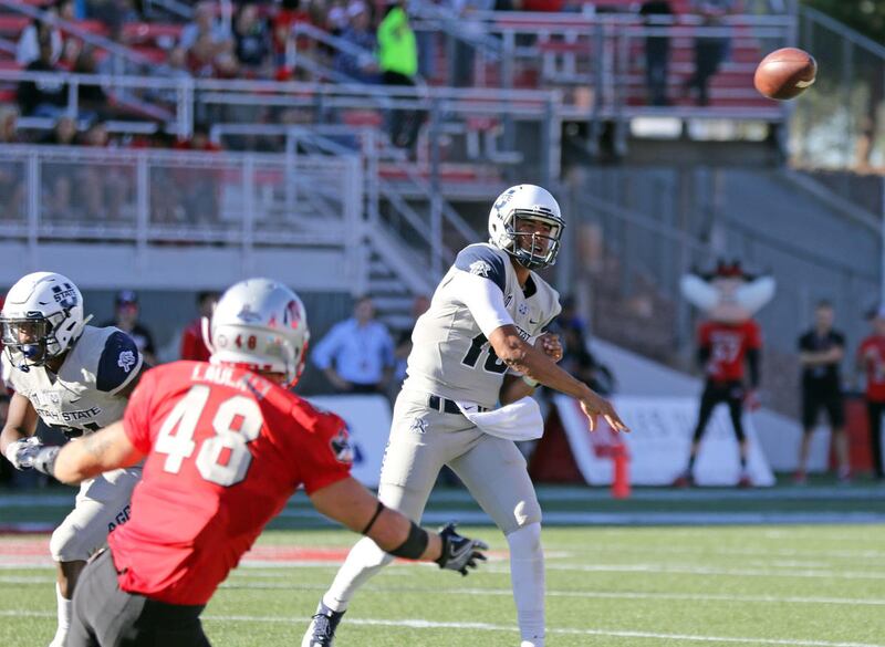The former Liberty High School standout finished the game by completing 19-of-27 passes. He also had 42 yards rushing on eight carries, including a 5-yard touchdown run with 6:38 left in the third quarter to give the Aggies (4-4, 2-2 Mountain West) the lead for good, 35-28.