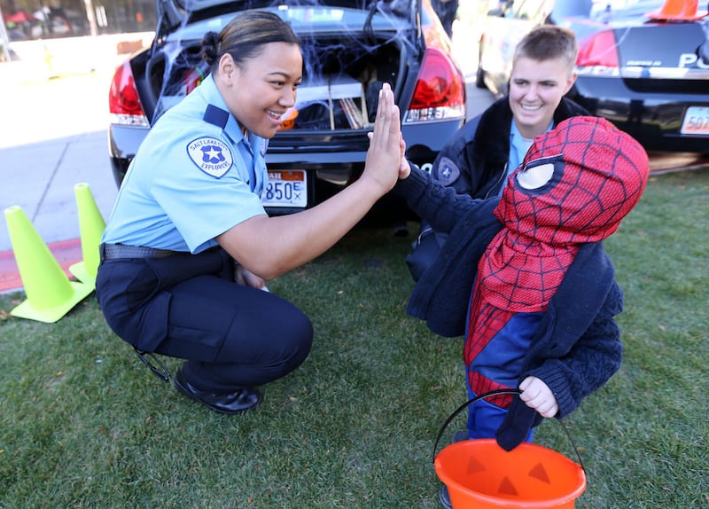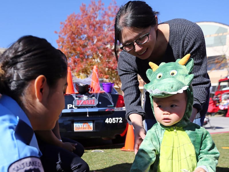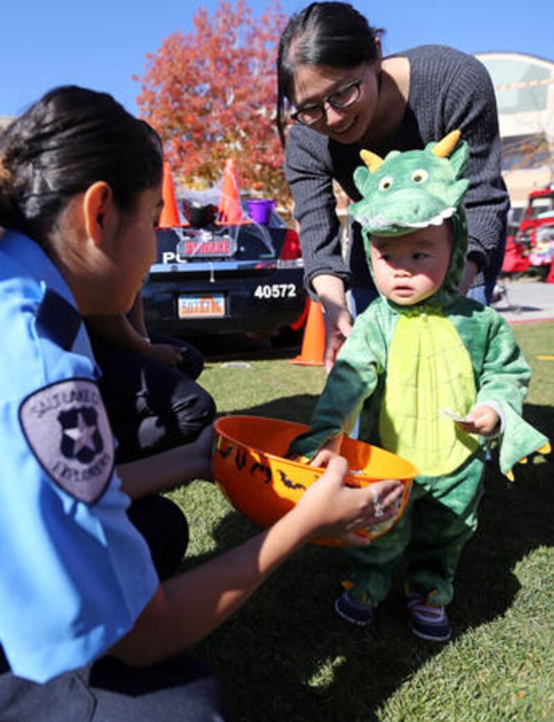 Ren Kimura reaches for some candy from Salt Lake City police's Trunk or Treat at the Utah Foster Care Pumpkin Festival at The Gateway in Salt Lake City on Friday, Oct. 21, 2016. | Kristin Murphy, Deseret News