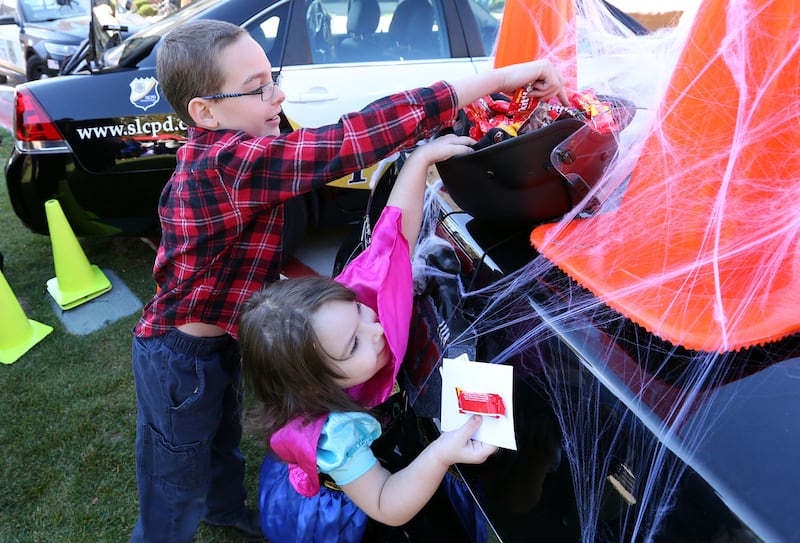 Jayden Hart and Nicole Hart reach for candy from Salt Lake City police's Trunk or Treat at the Utah Foster Care Pumpkin Festival at The Gateway in Salt Lake City on Friday, Oct. 21, 2016. | Kristin Murphy, Deseret News