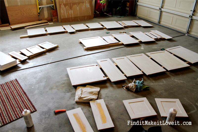 When setting up for painting, the cabinet doors should be raised off the ground so you can get around all the sides easily. We laid ours on 2 x 4's and scrap wood in our garage. Tape each cabinet’s number to the wood under it.