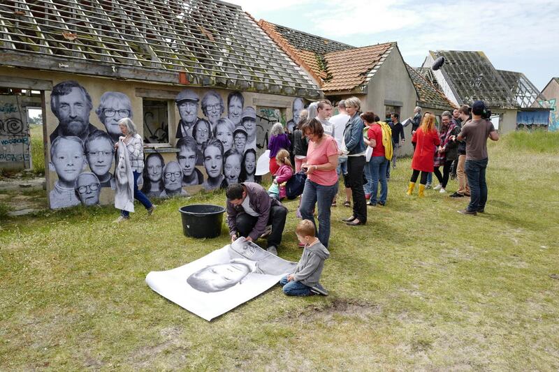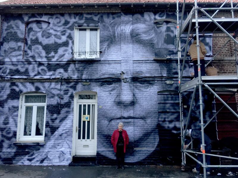 Early on, JR and Varda meet Jeannine Carpentier, who is the last remaining resident in a row of old miner homes scheduled for demolition. In tribute to her, JR and Varda create murals out of photographs of the miners who used to work the area, plastering them on the surrounding brick homes and putting together a special larger-than-life portrait of Carpentier to cover her own home.