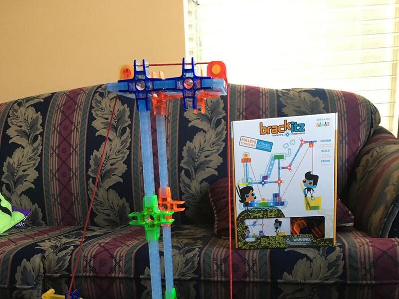 My first project was a crane and pulley system I set up on the edge of the living room coffee table (see photo attached). The crane and pulley parts were durable and snapped together easily. I threaded the string through the pulley, added the crank and attached a large yellow bucket. The bucket hung over the edge of the table all the way to the floor. It was a lot of fun to throw objects into the bucket from the floor and lift them all the way to the tabletop. The set includes plans for eight contraptions, including a working drawbridge and zip line. $40