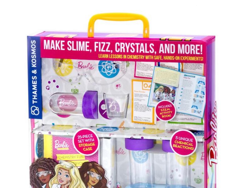 From Thames & Kosmos comes the Barbie fundamental chemistry set. What? A chemistry set marketed to girls? That's right, and it's themed with bright pink colors. The set comes with six safe, fun and inspiring experiments. Kids can create a colorful slime solution, an erupting test-tube volcano, a fizzing lava-lamp reaction, color-changing putty, a feathery crystal structure and bouncing putty. Each experiment teaches a scientific principle.