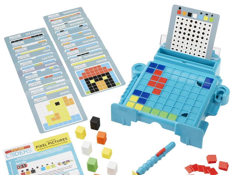 In the Alex Toys Future Coders line, the toy Poppin' Pictures will teach children how to decode symbols while uncovering a hidden picture. The toy is shaped like a robot with a huge gridlike belly. The belly contains an eight-by-eight grid with sunken squares that can hold colored square pieces called pixel tiles (they remind me of Chiclets gum). The toy includes 20 code cards that indicate which colored tiles to place on the grid according to a symbol. For example, the top row of the code card shows circles. Circles are associated with blue pixel tiles, so the child places blue tiles in the grid belly wherever circles are indicated.