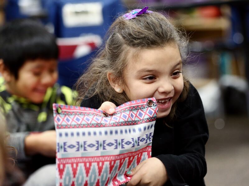 When she and other volunteers visited the kindergarten classrooms at Jackson Elementary, the students squealed and shouted in excitement after receiving their bags.