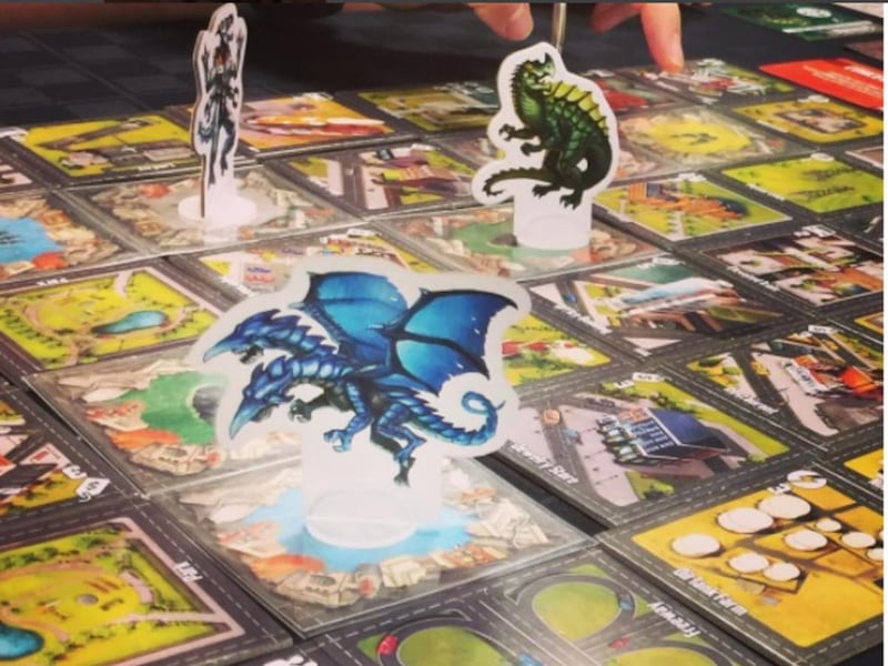 Each player takes one of four unique Kaiju monsters to play and a cardboard figure. A monster tile is added to a set of beautifully illustrated city block tiles. They are randomly assembled in a 7 x 6 grid (for four players). Monsters are placed on their start tiles. Each city tile is worth between one and five points.