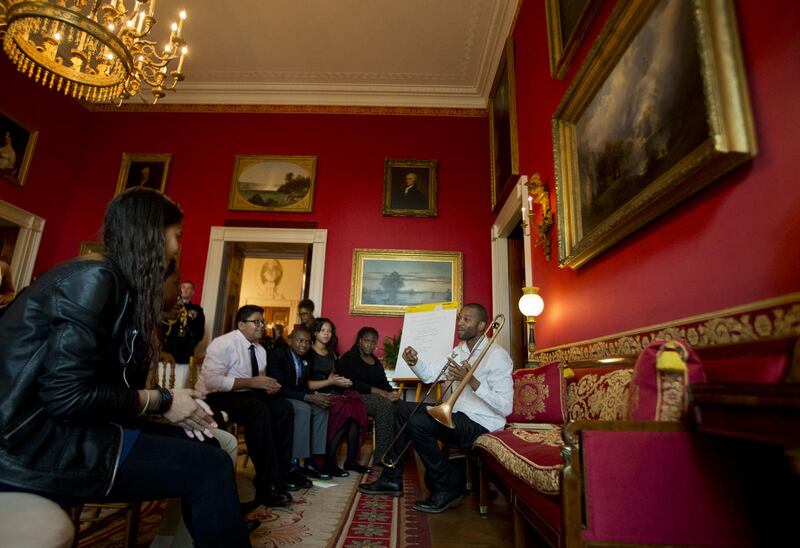Trombone and trumpet player Trombone Shorty, right, mentors a group of middle school students from the Washington area during a student workshop in the White House on Oct. 14, 2015, in preparation of the 50th anniversary of the National Endowment for the Arts and Humanities. | Manuel Balce Ceneta, Associated Press
