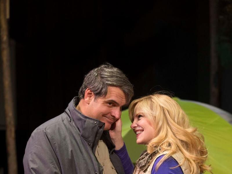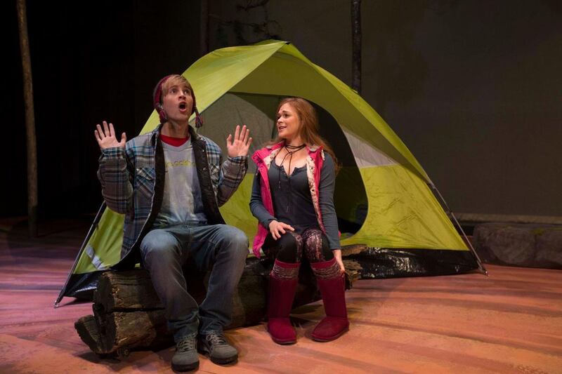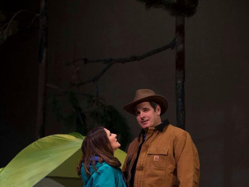 The set is wonderfully dressed as Mary's apartment, a ski rental shop, then as a campsite.
