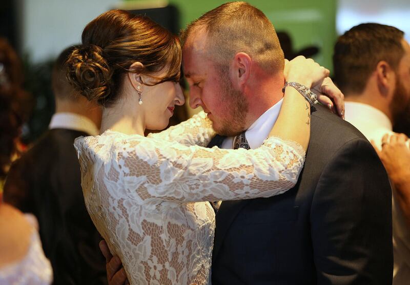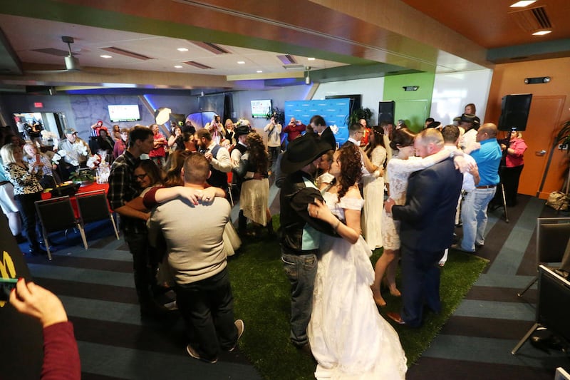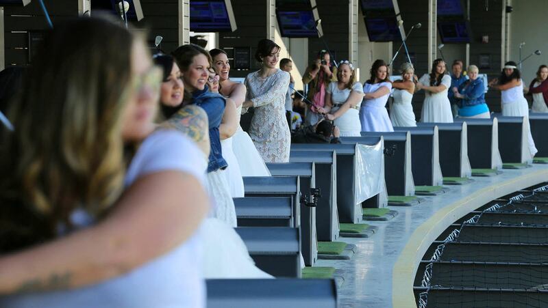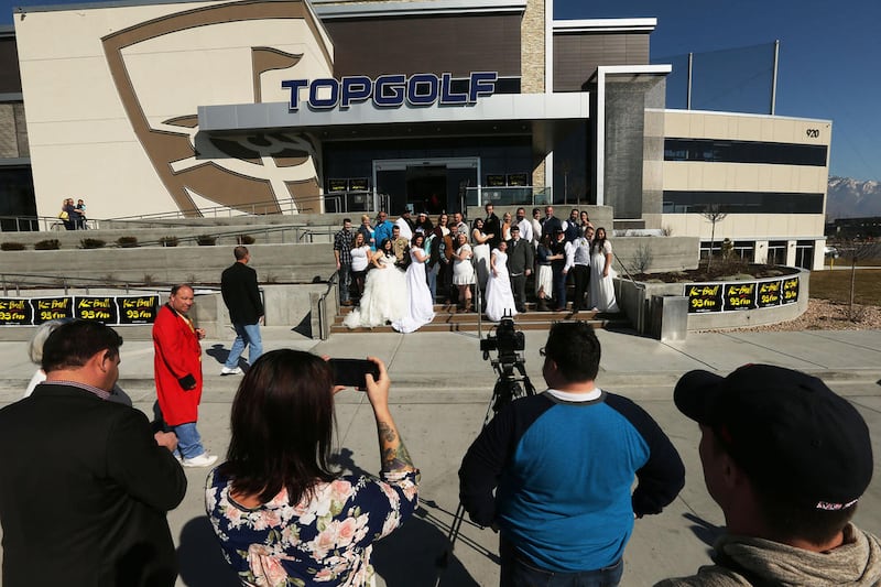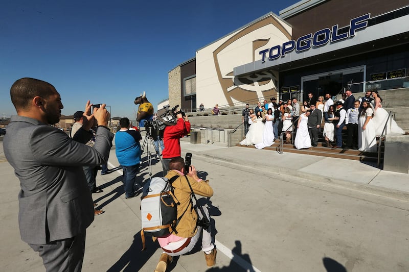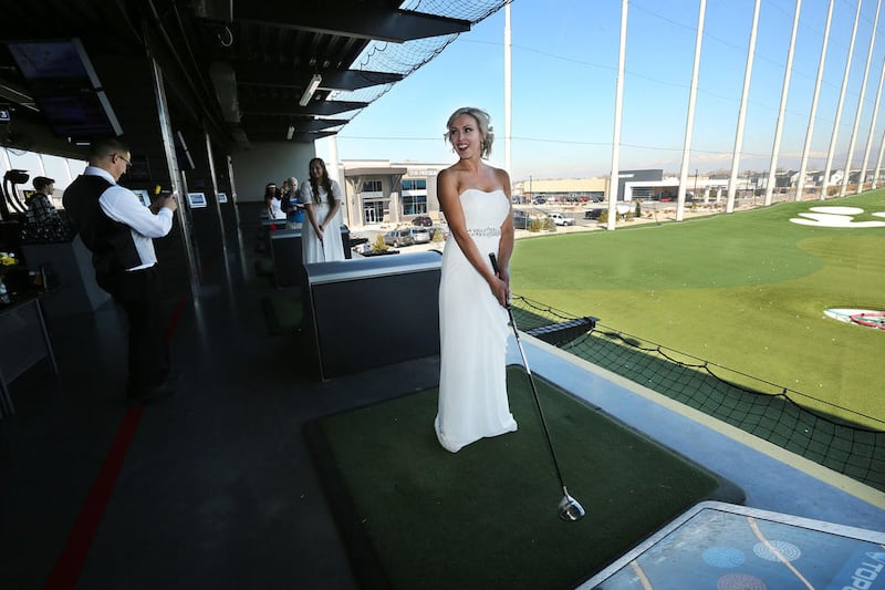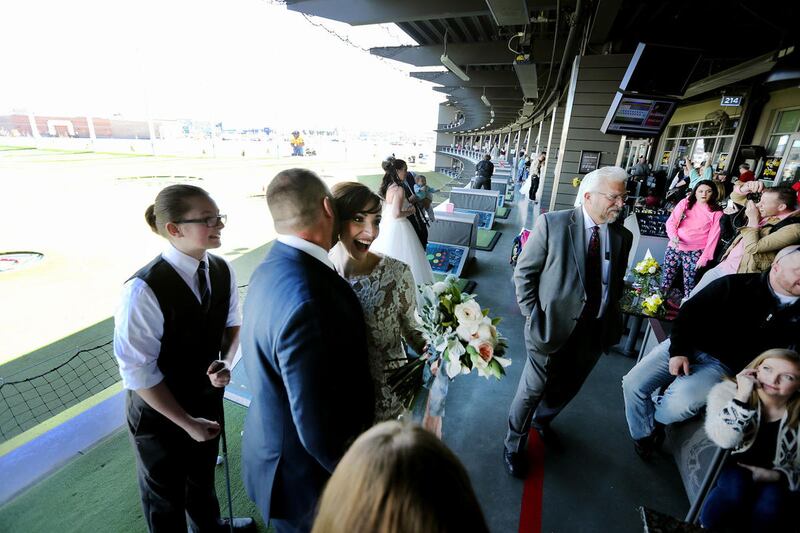 New bride Kacie Cruz poses for photos at Top Golf in Midvale on Tuesday where 17 couples got married in their own private golf bay. The Valentine's Day event was sponsored by the entertainment venue and K-Bull 93. Everything was on the house — from the officiant to the rings to a Las Vegas honeymoon for each couple.
