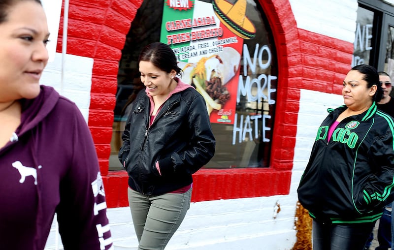 Aleman gathered with her employees outside the Beto's restaurant on Washington Boulevard Thursday, where two painted pickup trucks blocked entrances to the drive-thru and parking lot. The trucks were marked with both Mexican and American flags and bore messages including "Our voice matters" and "No more hate."