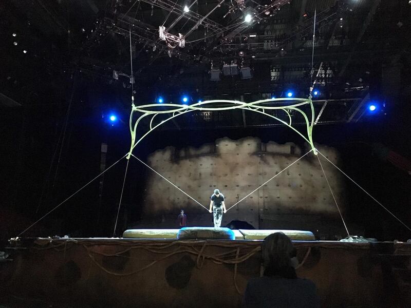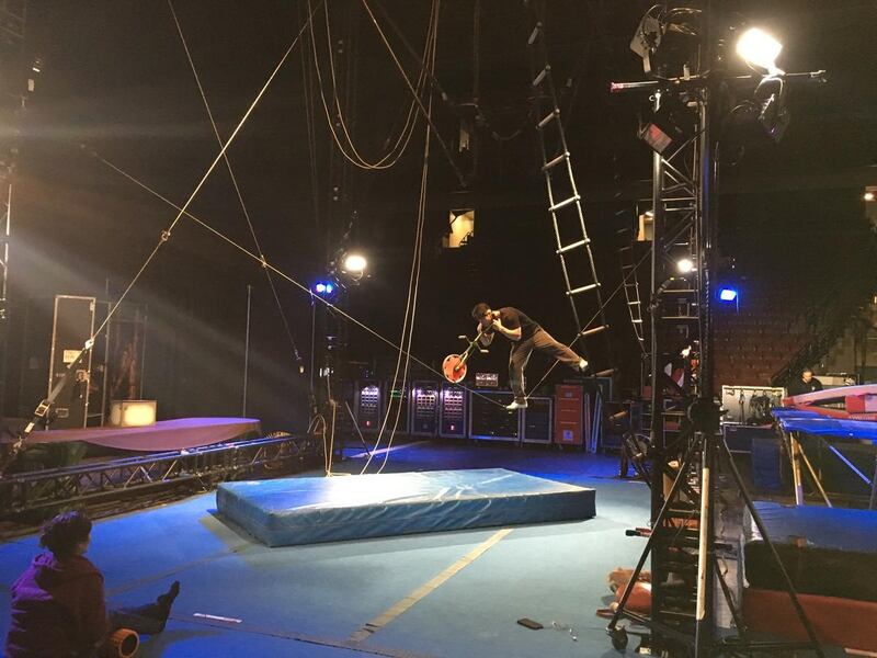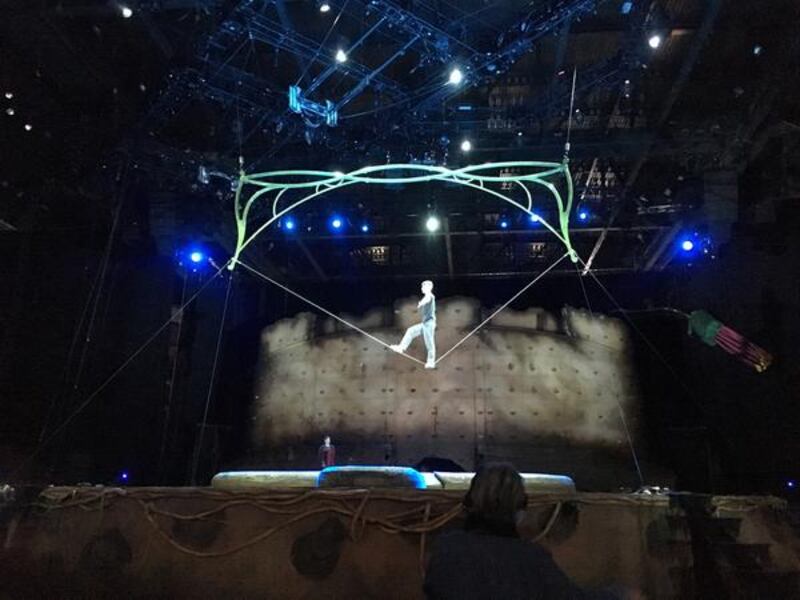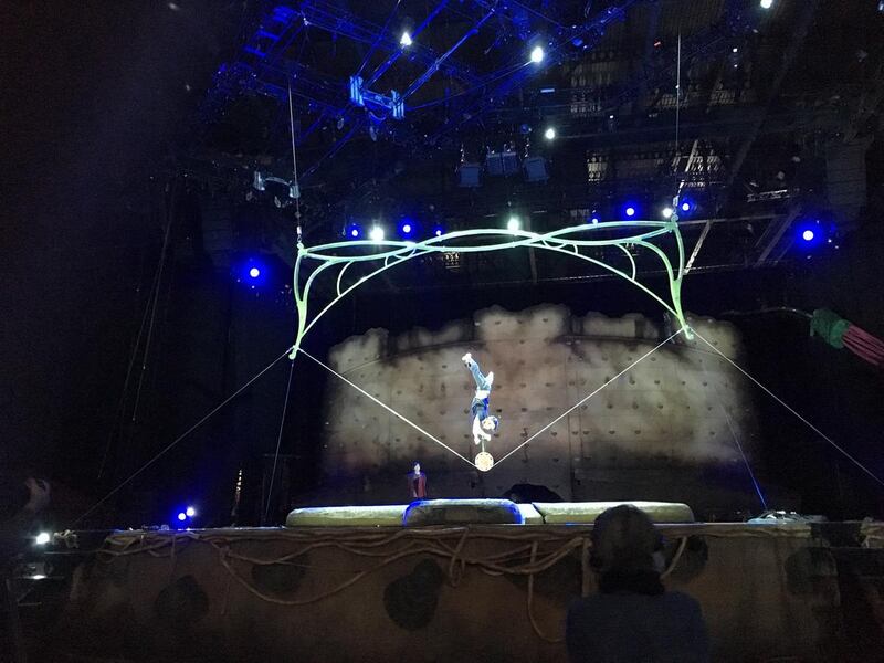 Many of the performers come from a sports background, but some also have experience performing in the circus. Qiu Jianming, who practices the slackwire act below, performed in the circus with his mother before becoming a part of Cirque du Soleil.