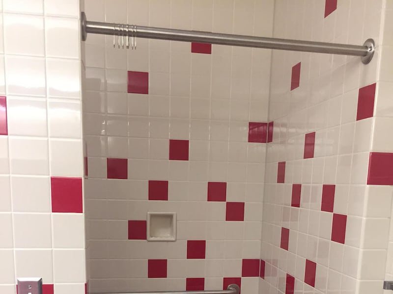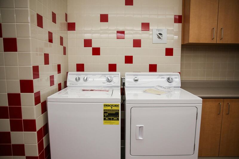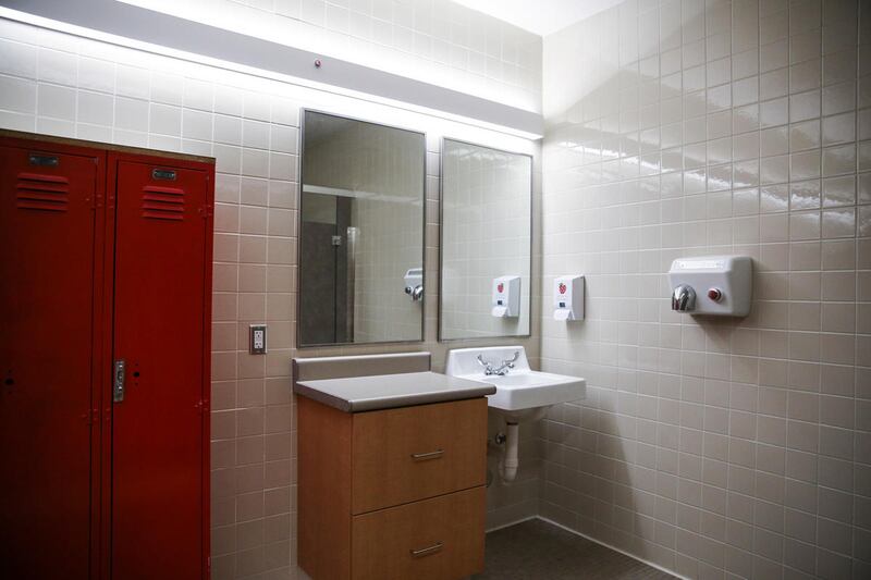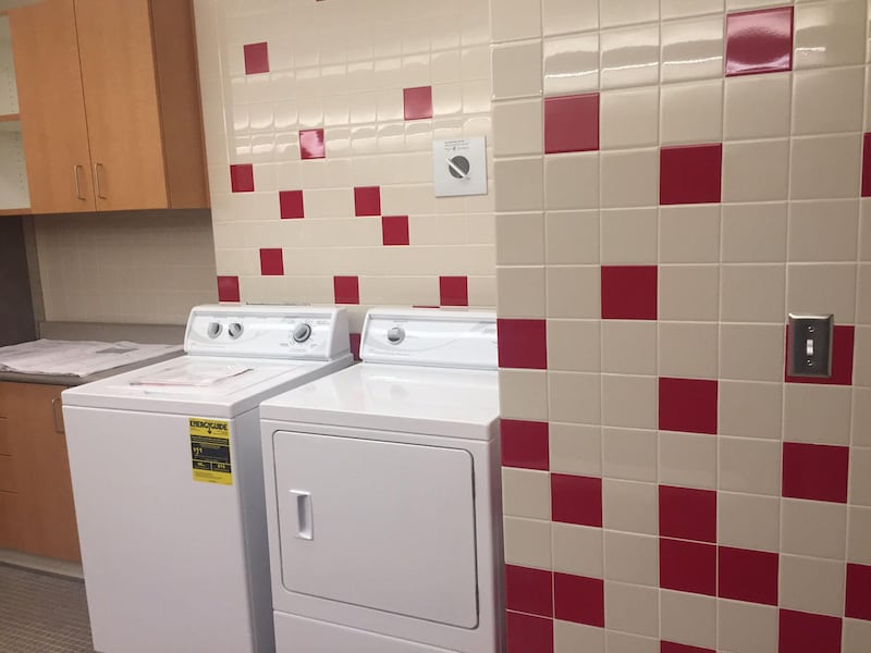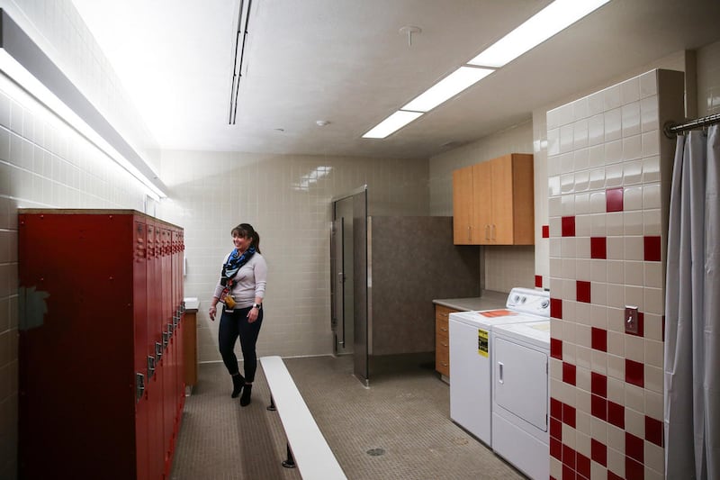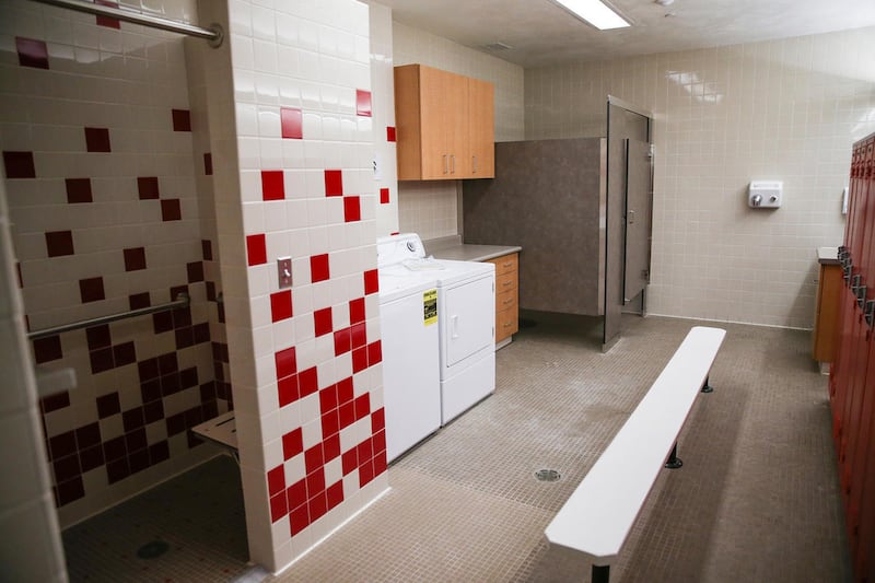 Each now has fresh paint, a washing machine and clothes dryer, lockers with donated clothing and a shower with red and white tile, the school’s colors.