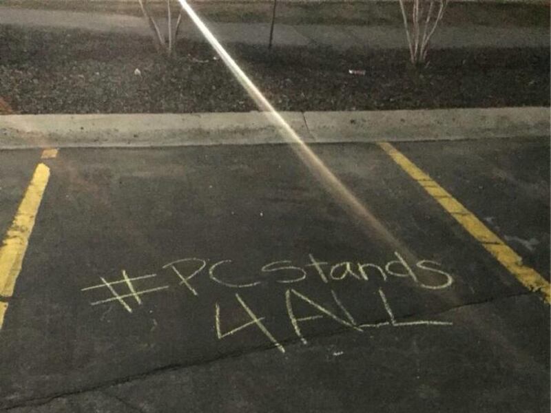 Moyes joined about a dozen other students at the school early Tuesday to write the positive messages around the parking lot. Senior Grace Mason said as people arrived, more wanted to join in. They said they wanted to counteract any negative feelings that may have come up from students who saw the earlier message across the street.