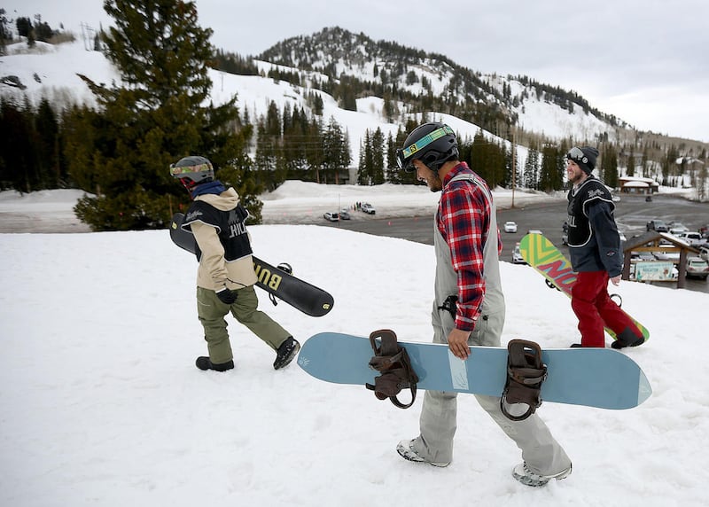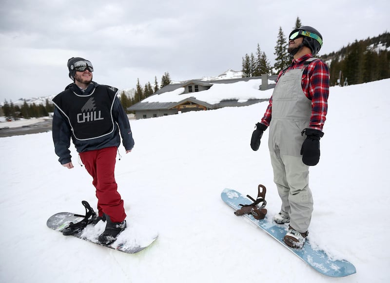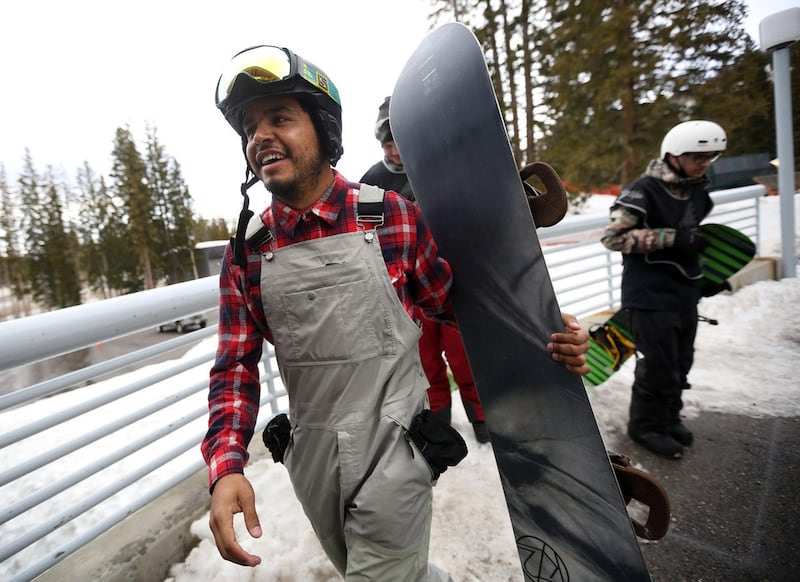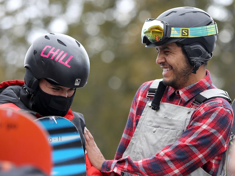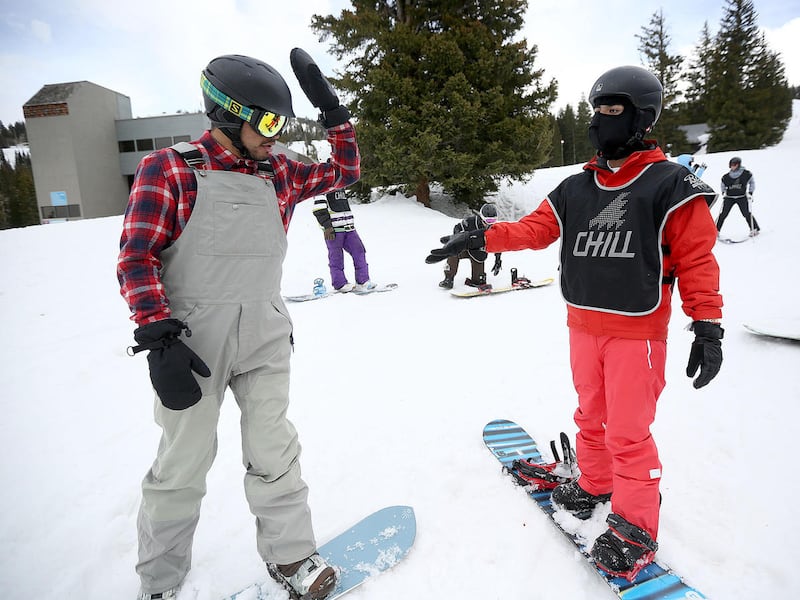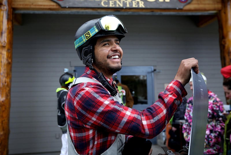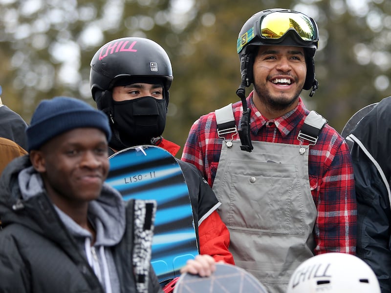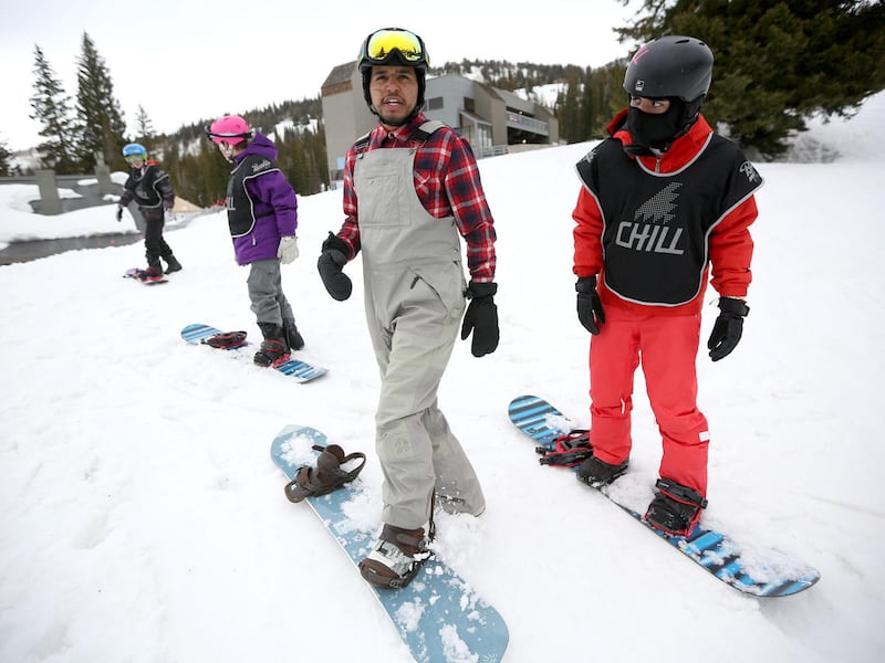 Ricky Ballesteros poses for a group photo with the Chill Foundation before snowboarding at Brighton on Monday, March 20, 2017. (Kristin Murphy, Deseret News)