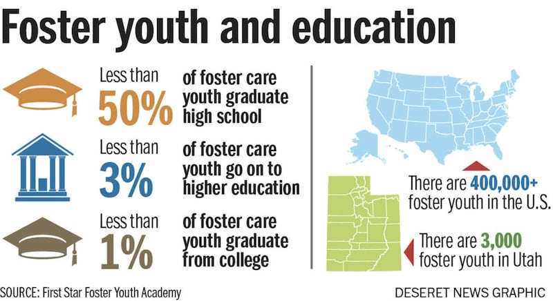 National data show fewer than half of foster youths even graduate from high school, compared to 82 percent of students overall. While slightly more than half of high school students nationally go to college and 30 percent earn a degree, fewer than 3 percent of foster youths ever enroll in higher education and an abysmal one-third of 1 percent — 0.03 percent — graduate. Utah does a little better than average with high school graduation rates, but mirrors national college statistics, said Crystal Vail, Youth Services Program administrator for the state.