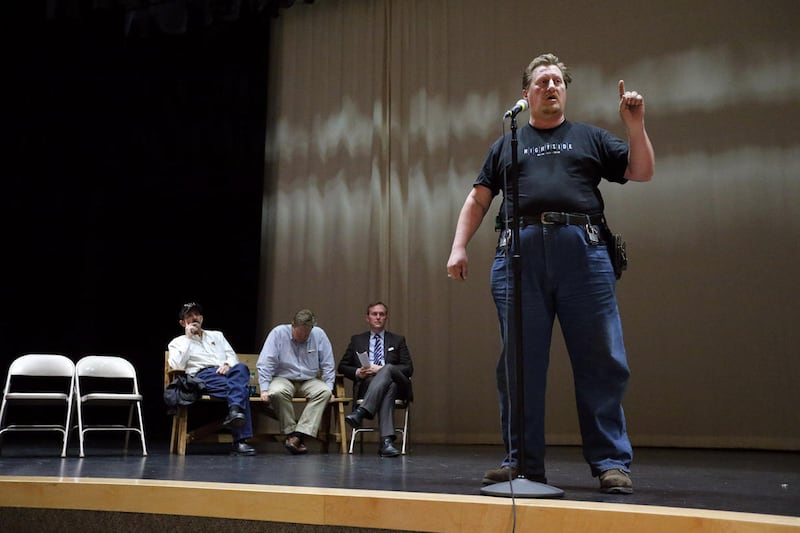 "No, you work for us!" one resident shouted, before the auditorium erupted in more jeers. Some residents leaped out of their seats and walked toward the stage, shouting at the mayor.