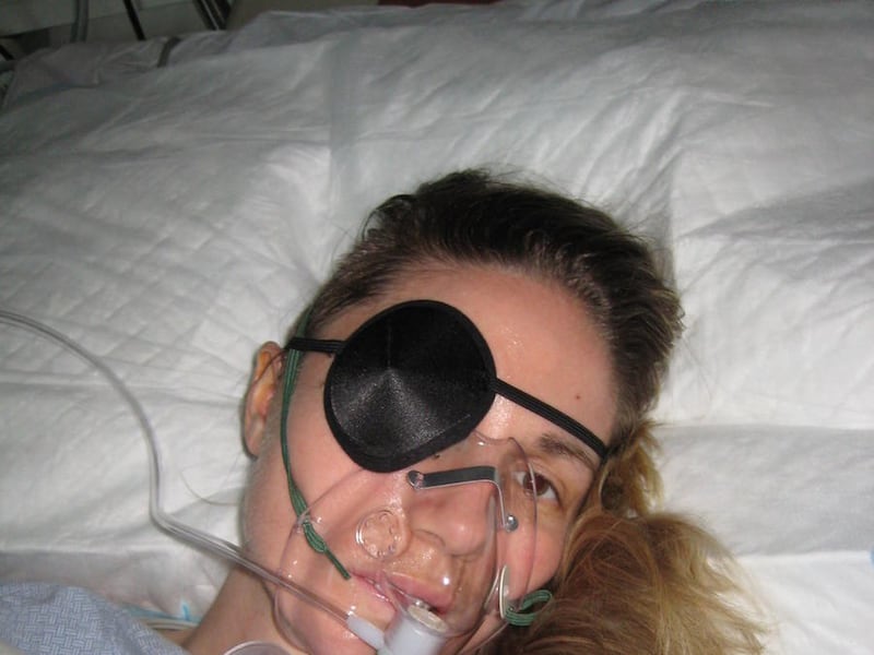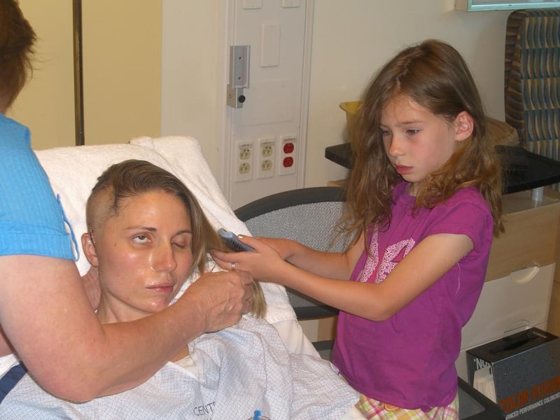 Of all the complications and side effects from the surgeries, the facial paralysis was the most noticeable. She had paralysis on the entire right side of her face. She had to wear an eyepatch. She couldn’t move her eye, couldn’t blink, had slurred speech and couldn’t close the right side of her mouth, making eating difficult. Her 2-year-old son was scared of her. Her skin and her eye socket weren’t holding her eye in, meaning more surgeries, including the addition of a mechanical spring to her eyelid to help her close her eye.