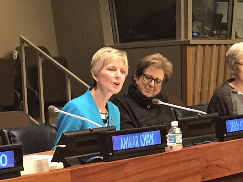 Moderator Caryl Stern, president and CEO of the U.S. Fund for UNICEF, posed a question to the panelists about those who disagree and criticize efforts to help the world's 23 million refugees.