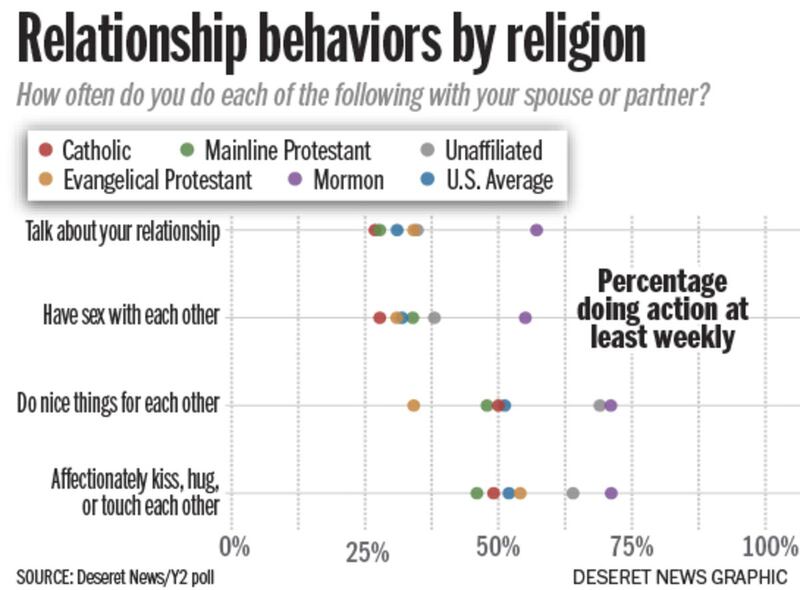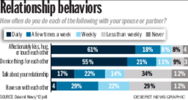 The frequency of sex, of course, matters, too. In the Deseret News poll, 4 percent of committed couples said they are intimate daily; 30 percent, a few times a week; and 22 percent weekly. Among Mormons, the daily number is identical to the national average, but figures are slightly higher elsewhere: 38 percent a few times a week, and 28 percent weekly.
