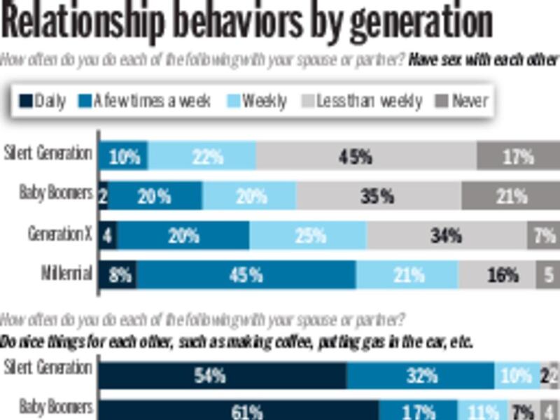 But it's the youngest couples who are having the most sex: Eight percent of millennials say they make love daily, compared to 2 percent of baby boomers.