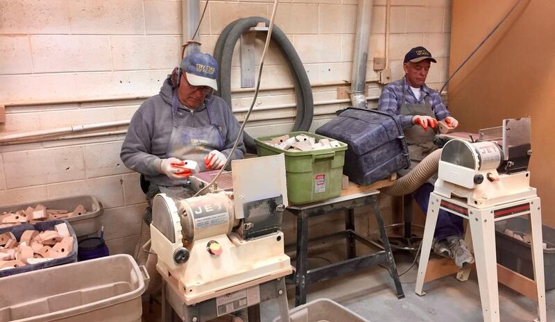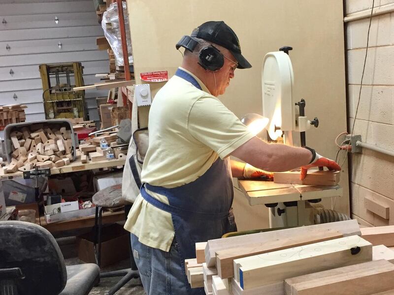 At the factory, everybody has an assigned spot in the Tiny Tim’s assembly line as a block of wood gets traced, cut, drilled, sanded, routed, assembled with wheels and stained.