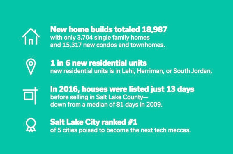 Utah’s strong economy and continued job growthespecially in the tech sectorhas driven up home prices (the median price for a single-family home in Salt Lake County was $274,000 in January), increased demand for new vacancies, and shrunk the average number of days it takes to sell a home along the Wasatch Front. Additional housing stats reveal how quickly Utah’s market is changing.