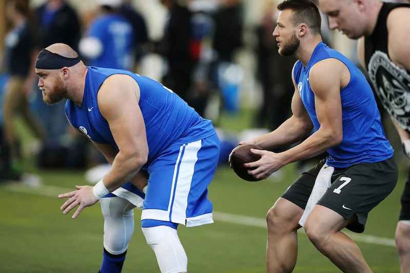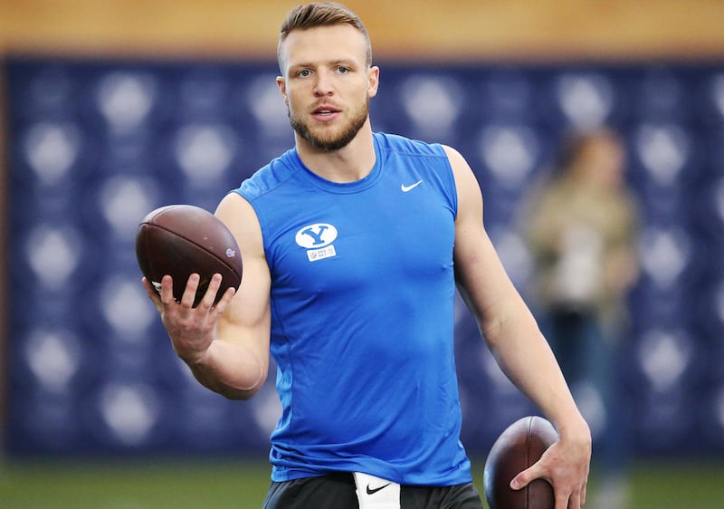 Hill ran and threw without his shirt on at Pro Day. Stroshine saw former San Diego Charger and SUU quarterback Brad Sorensen standing nearby in BYU’s indoor practice facility. “Brad,” asked Stroshine, “How many NFL quarterbacks look like that?”