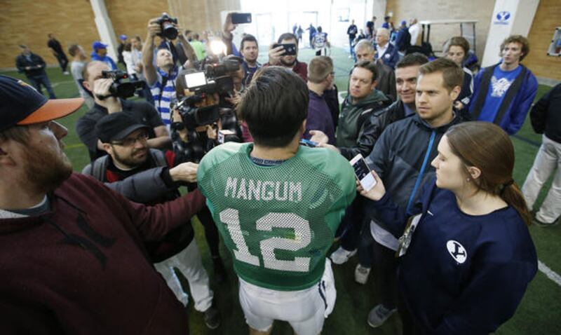 Brigham Young Cougars quarterback Tanner Mangum (12) talks with media after BYU football alumni day practice in Provo on Friday, March 31, 2017. He discussed the challenge depression has posed in his life during a recent #MentalHealthMatters campaign the university sponsored. | Jeffrey D. Allred, Deseret News