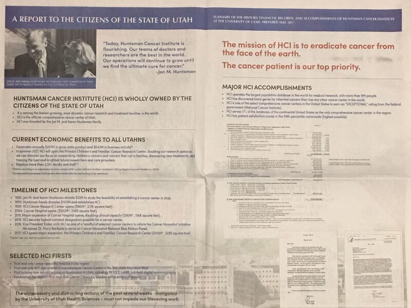 Titled "A Report to the Citizens of the State of Utah," the ad states that Huntsman Cancer Institute is "wholly owned by the citizens of the state of Utah."