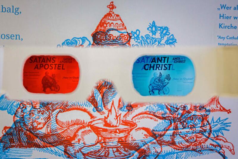 Luther House is also hosting an exhibit through Nov. 5, titled, “Heretic, Schismatic, Teacher of the Faith — The Catholic View of Luther.” Upon entry, guests are given what appear to be 3D glasses with one blue lens and one red lens. However, instead of seeing a 3D Luther, the blue lens gives the Protestant view of Luther and the red lens the Catholic view.