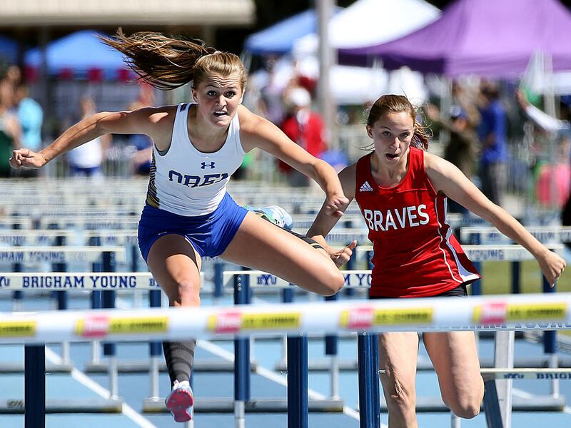100 hurdles — 1. Paige Young, Orem, 14.91; 2. Lindsey Middleton, Timpview, 15.13; 3. Madeline Martin, Hillcrest, 15.14; 4. Rachel Whipple, Bountiful, 15.27; 5. Alexis Koetitz, Box Elder, 15.33; 6. Grace Cobabe, Hillcrest, 15.60; 7. Lizzie Mitton, Timpview, 15.74; 8. Daisy Barker, Ogden, 15.77.