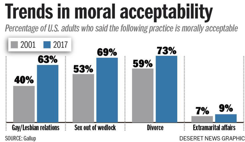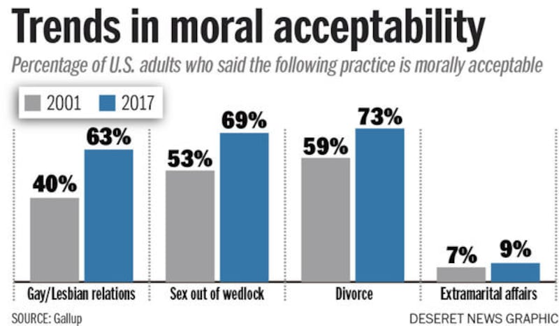 "Since the early 2000s, the percentage saying that gay or lesbian relations, having a baby outside of marriage, sex between an unmarried man and woman, and divorce are morally acceptable have increased by double digits," Gallup reported.