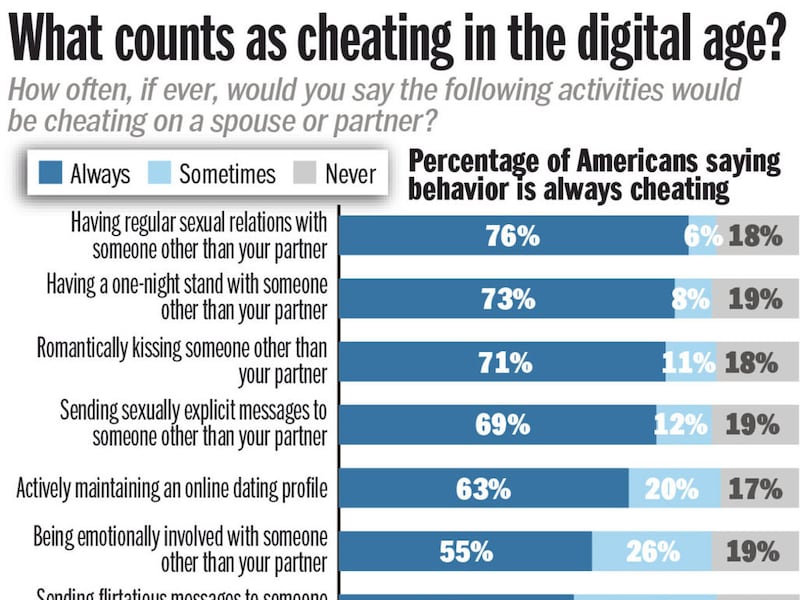 Half of Americans "say sending flirtatious messages is always cheating, 19 percent say the same about watching pornography without a partner and 16 percent say following an ex on social media is always cheating. But in each of these cases, at least 25 percent of respondents say these activities 'sometimes' constitute cheating," the Deseret News reported, drawing on a survey commissioned for the article.