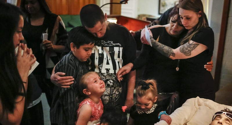 Matt Hall Jr. pays his respects to his father during his funeral at the Myers Mortuary in Ogden on Saturday, April 15, 2017. "I wish you weren't paralyzed," Matt Hall Jr. told his father. "I wish you weren't dead." | Nicole Boliaux, Deseret News