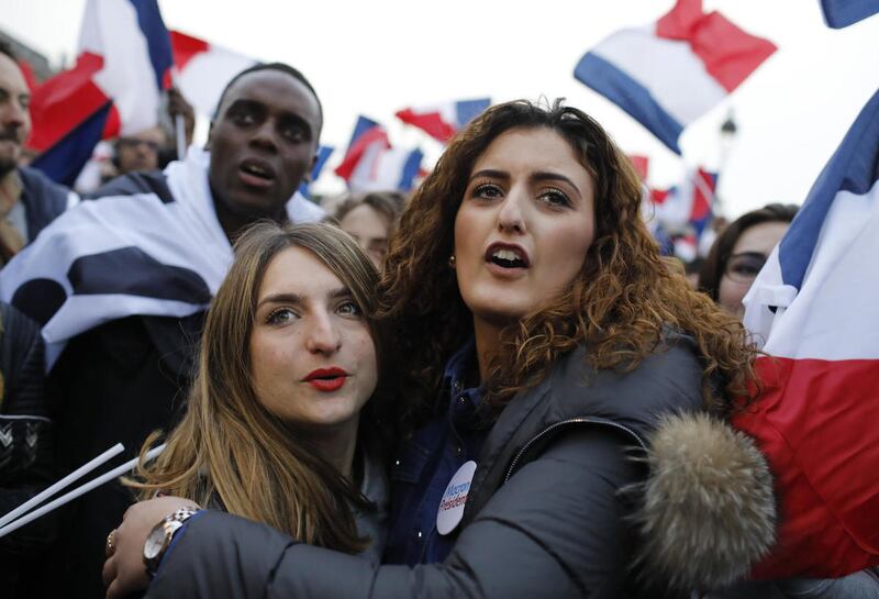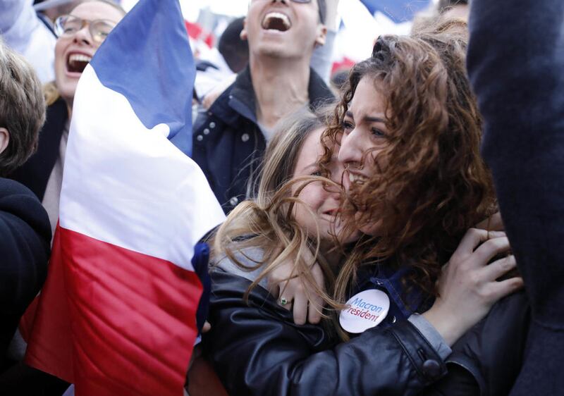 A crowd of Macron supporters roared with delight at the news, jubilantly waving red, white and blue tricolor flags at a victory party outside the Louvre Museum in Paris.
