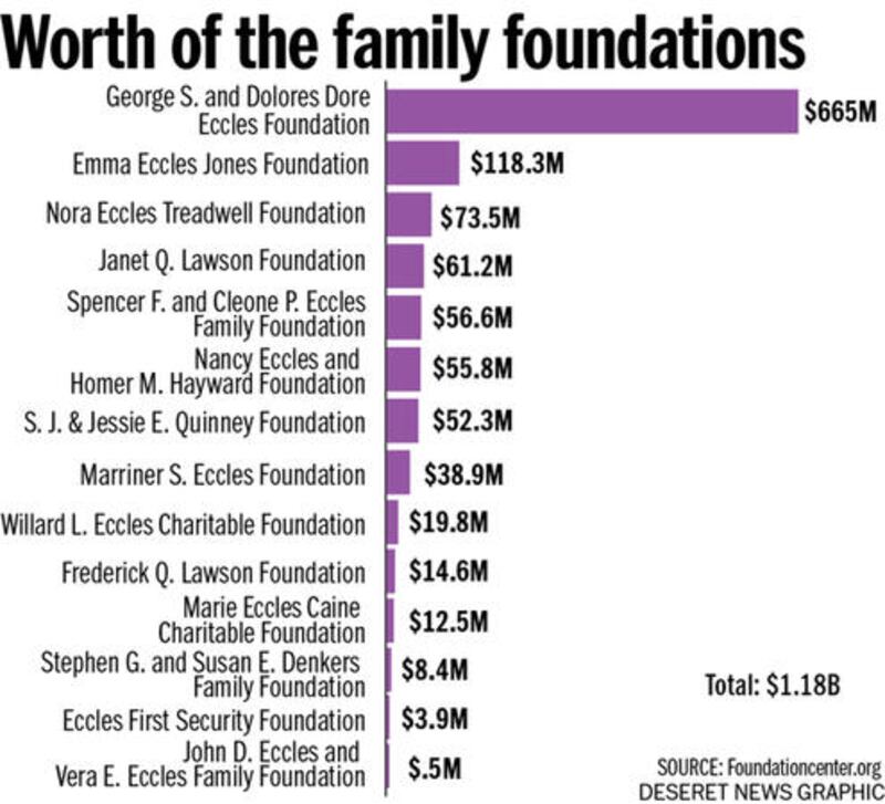 The John D. and Vera E. Eccles Family Foundation ($500,000), Eccles First Security Foundation ($3.9 million), Stephen G. and Susan E. Denkers Family Foundation ($8.4 million), Marie Eccles Caine Charitable Foundation ($12.5 million), Frederick Q. Lawson Foundation ($14.6 million), Willard L. Eccles Charitable Foundation ($19.8 million), Marriner S. Eccles Foundation ($38.9 million), S.J. and Jessie E. Quinney Foundation ($52.3 million), Nancy Eccles and Homer M. Hayward Foundation ($55.8 million), Spencer F. and Cleone P. Eccles Family Foundation ($56.6 million), Janet Q. Lawson Foundation ($61.2 million), Nora Eccles Treadwell Foundation ($73.5 million), and Emma Eccles Jones Foundation ($118.3 million) have $516.3 million between them. Add in the $665 million from the George S. and Dolores Doré Eccles Foundation and you have more than $1.1 billion.