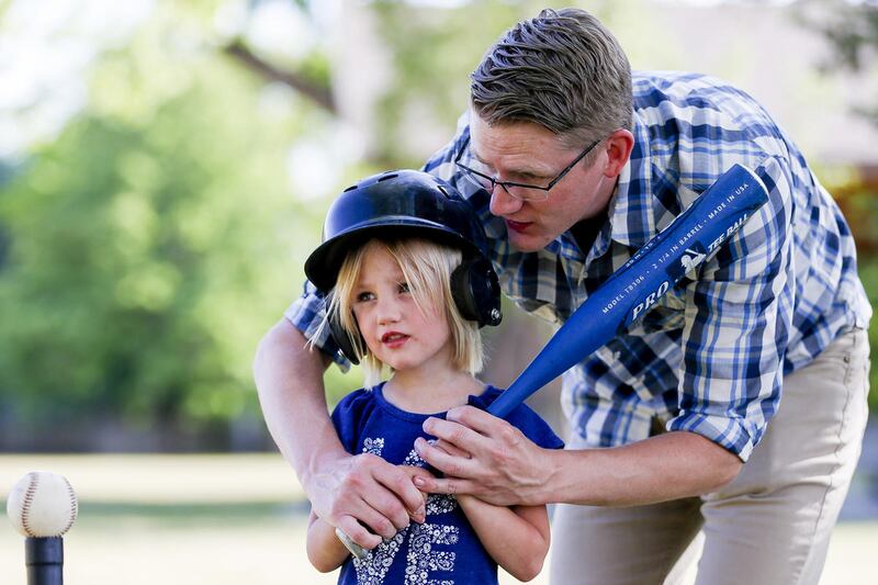 Alex Jensen instructs his daughter Olivia Jensen, 5, how to hit, at Edgemont South Stake Park in Provo on Tuesday, May 30, 2017. | Alex Goodlett, Deseret News