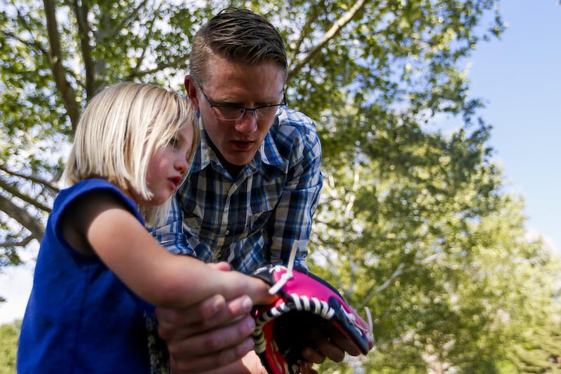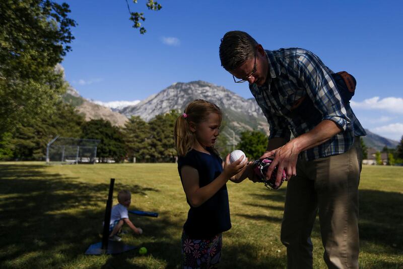 Alex Jensen instructs his daughter Charlotte Jensen, 6, how to use her glove, at Edgemont South Stake Park in Provo on Tuesday, May 30, 2017. | Alex Goodlett, Deseret News