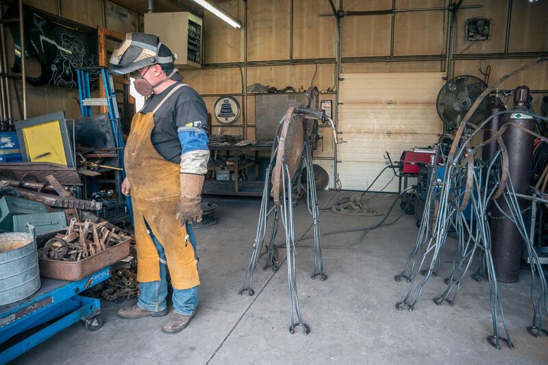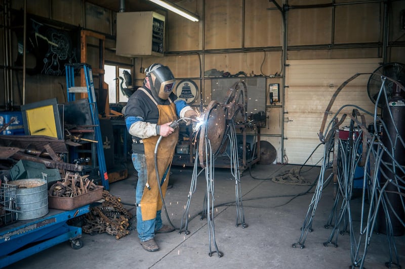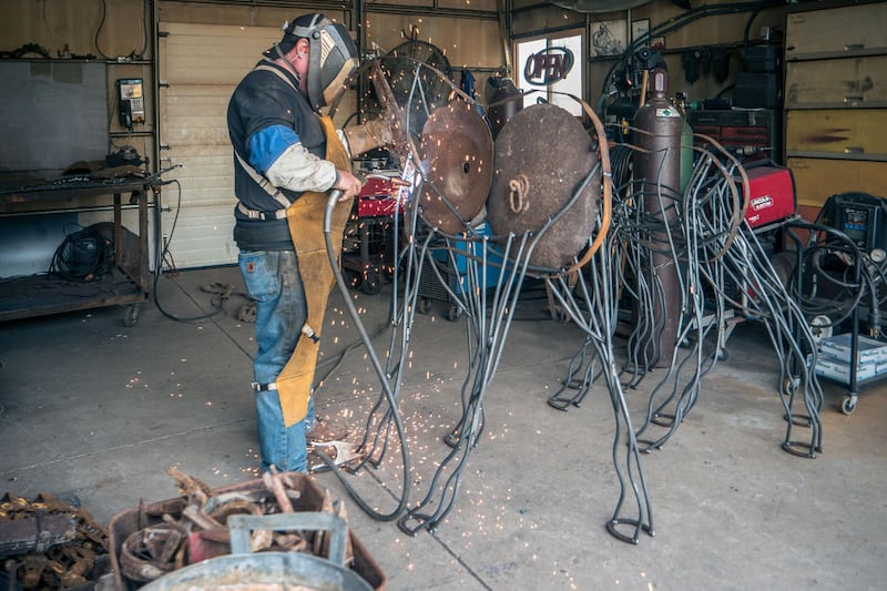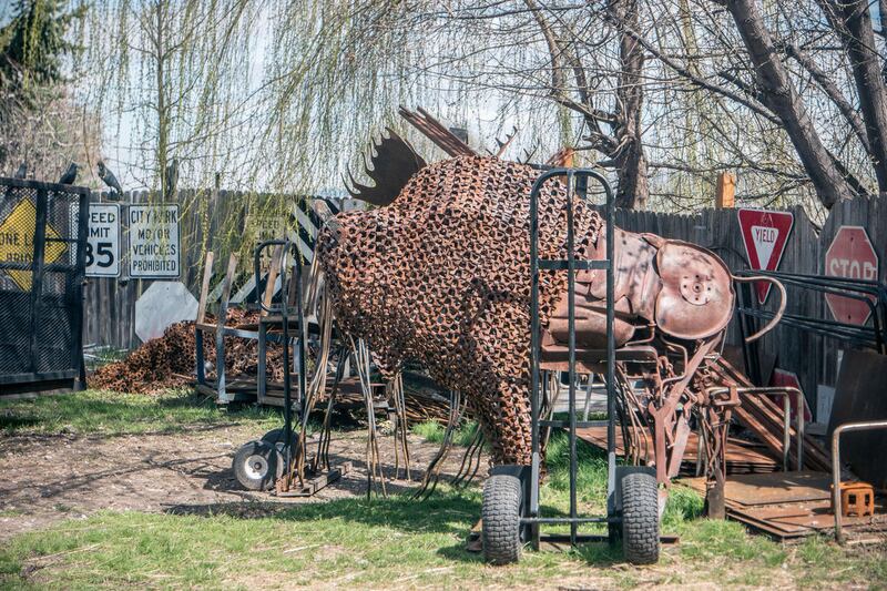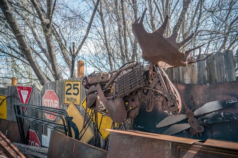 Finished sculptures surround the workshop: an imposing, life-size bison, welded together from conveyor belt chains and other parts, stands near several moose sculptures, made up of old tractor seats, pitchforks, hammers, monkey wrenches and an assortment of other rusty old bits of metal left behind, now reclaimed and made into art.
