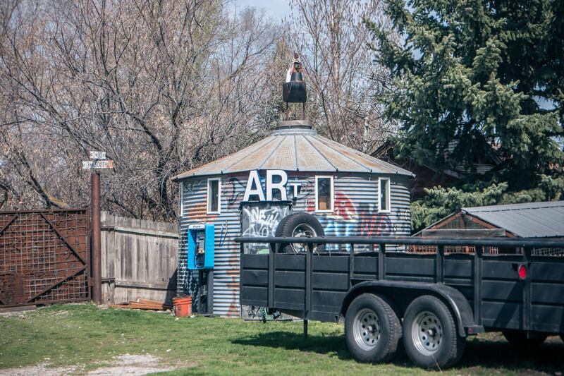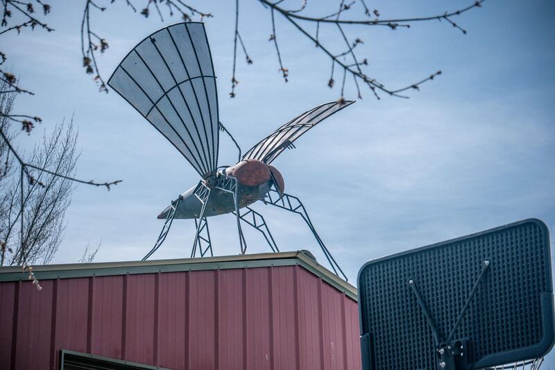 Pierson's home — and backyard workshop — are just a few blocks from Lewiston's Main Street. Colorful skis line the fence around an old '20s-era train station that Pierson converted into a house, where he lives with his wife and two teenage children. A tall, rusted metal sculpture of a child swinging in the hands of his parents sits in the front yard, and beyond a similarly artistic-looking front gate, a massive 12-foot metal fly with a World War II-era bombshell for a body and satellite dishes for wings can be seen perched atop Pierson’s workshop.