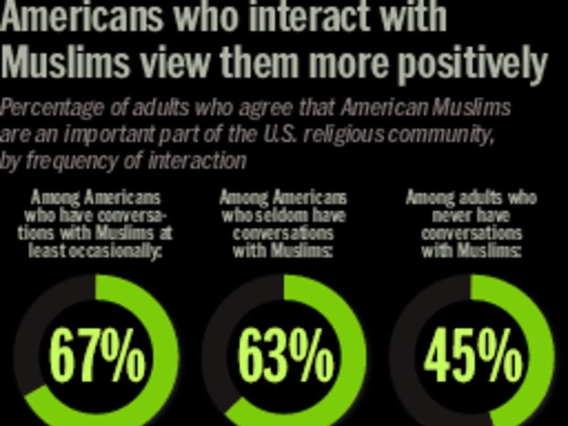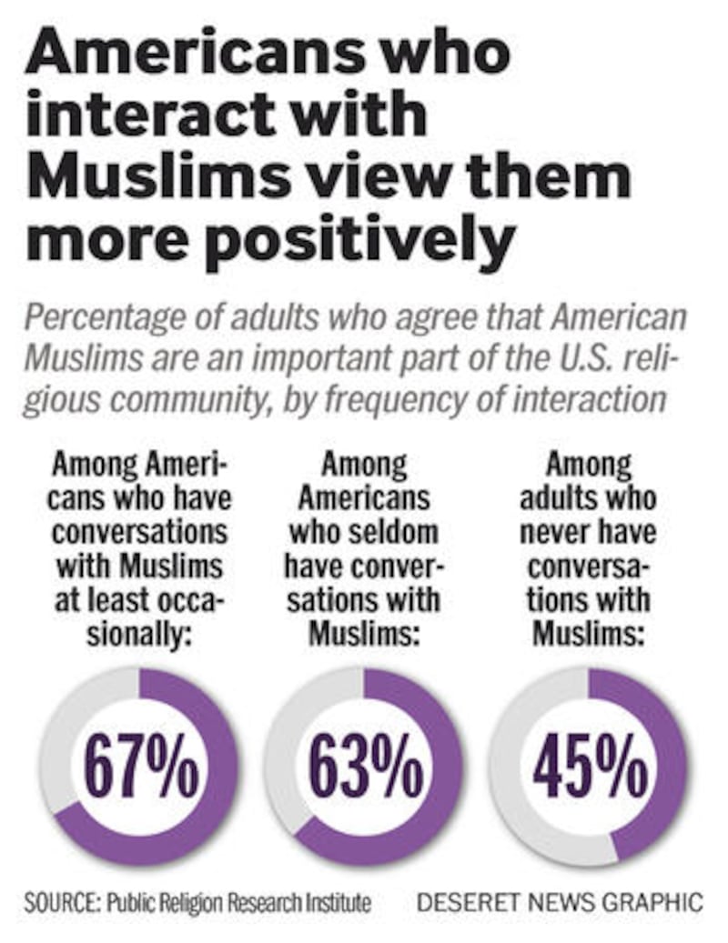 For example, two-thirds of U.S. adults who at least occasionally had a conversation with a Muslim over the last year said that Muslims are an important part of the American religious community, compared to 45 percent of adults who never interacted with a member of this faith group, according to a recent survey from Public Religion Research Institute.