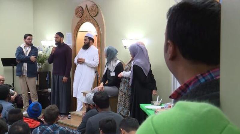 Dozens of people attend the "Meet the Muslims" event at the Utah Islamic Center in Salt Lake City, Friday, Dec. 2, 2016. After the prayer, a brief presentation on Islam was given, followed by a question-and-answer session hosted by a panel of Muslims, including Imam Shuaib Din, center. | Tanner Siegworth, Deseret News