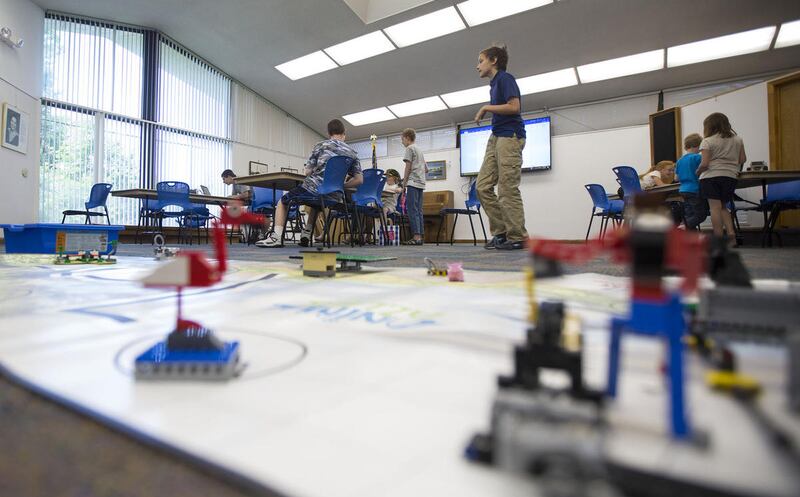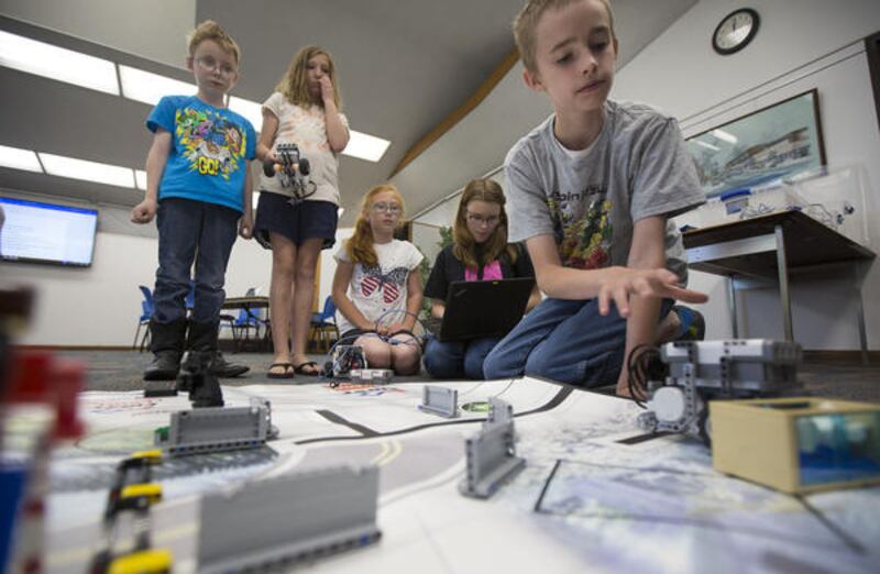 Campers attempt to move a Lego shark tank to a different end of the map using their newly constructed and programmed Lego robots while attending the STEM summer camp at the Ruth Vine Tyler Library in Midvale, Friday, June 9, 2017.| Kelsey Brunner, Deseret News