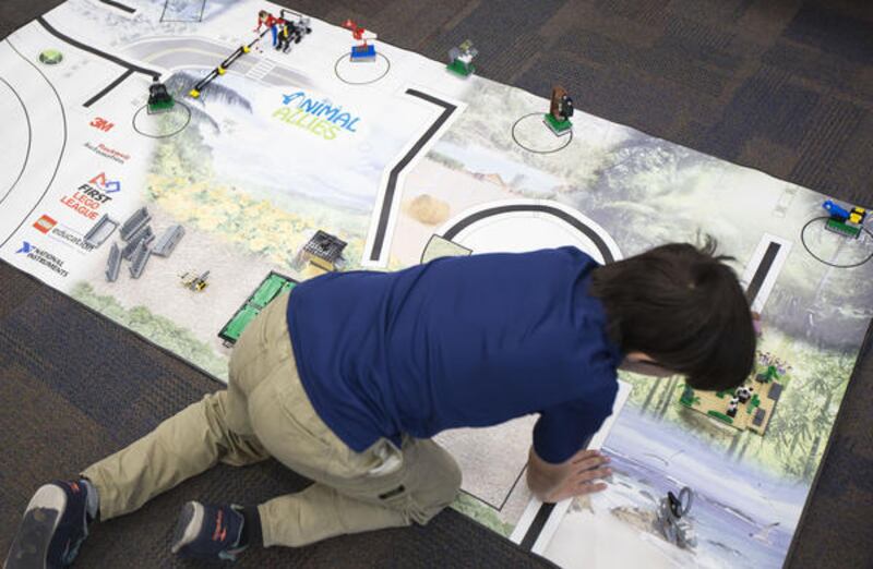 Seth Ivie, 12, helps the camp coordinators lay out the obstacles on the map that the campers will use to test their robots while attending the STEM summer camp at the Ruth Vine Tyler Library in Midvale, Friday, June 9, 2017.| Kelsey Brunner, Deseret News
