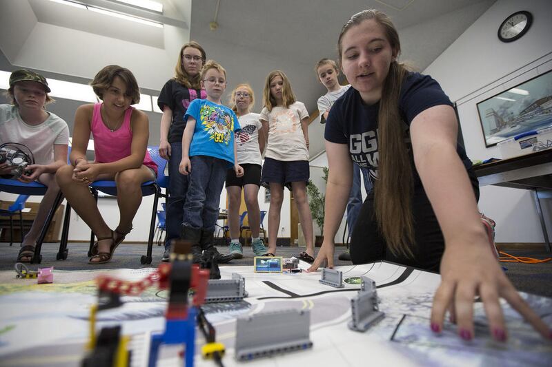Camp coordinator Melissa Ivie explains the challenges the campers will have to complete with their newly constructed Lego robots while attending the STEM summer camp at the Ruth Vine Tyler Library in Midvale, Friday, June 9, 2017. | Kelsey Brunner, Deseret News