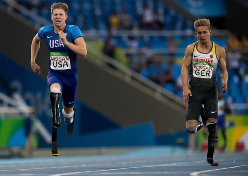 Hunter Woodhall, left, runs the final leg in the Men's 4x100m in the Olympic Stadium at the Paralympic Games, Rio de Janeiro, Brazil, Sept. 12, 2016. | Bob Martin for OIS