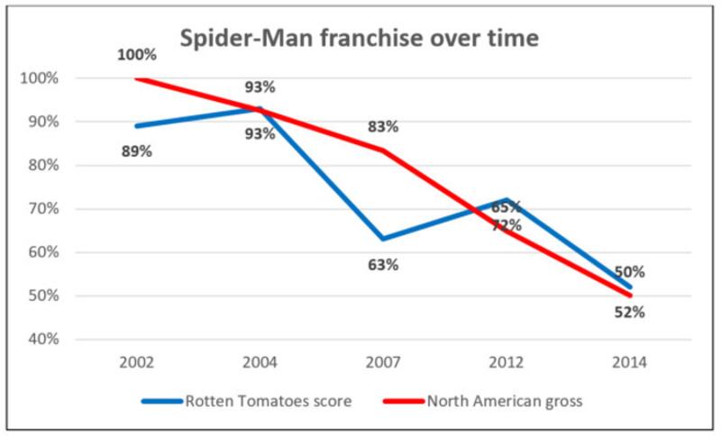 An irrefutable fact of Spider-Man’s film performance is that his first outing in 2002 was his most successful, and every subsequent film has made less money than the previous one. And while the critical reception has been mixed, the quality follows a similar downward slope. (I put the box office receipts as a percentage of the 2002 film because otherwise the scale is completely off.)
