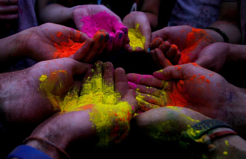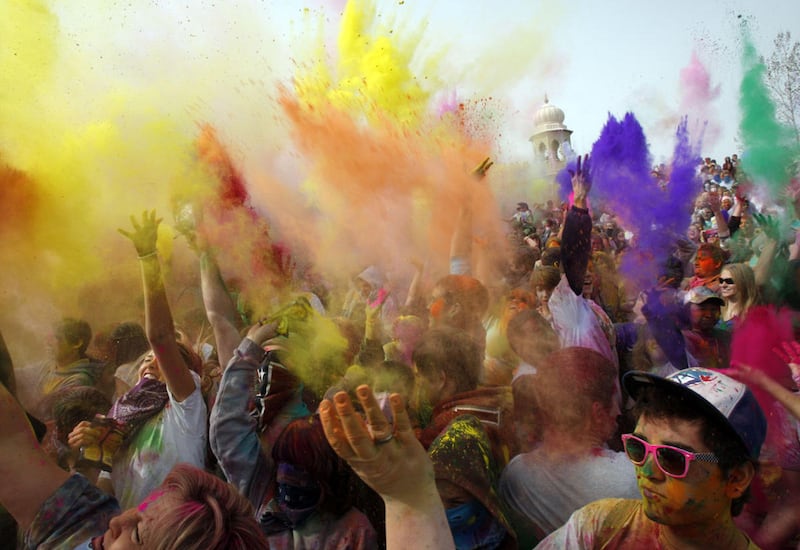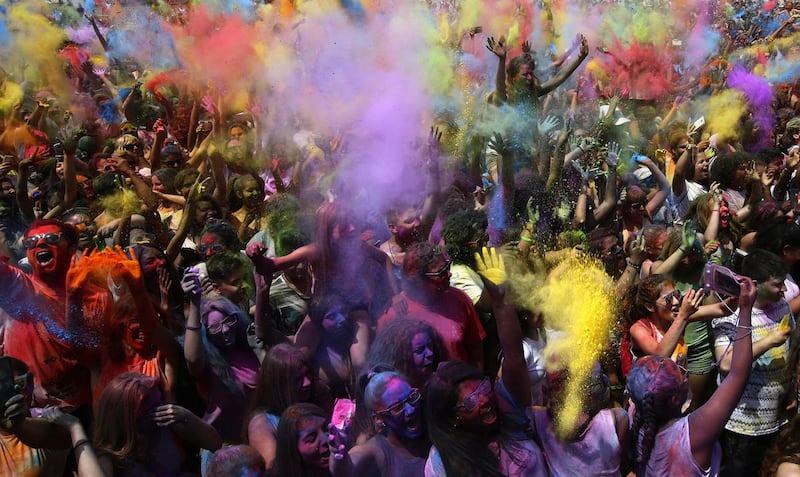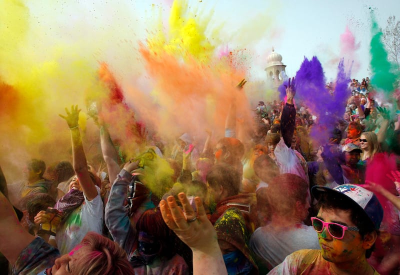 FILE - Visitors of the Holi Festival of Colours throw special colored powders in the air in Barcelona, Spain, Sunday, April 6, 2014. The festival is fashioned after the Hindu spring festival Holi, which is mainly celebrated in the north and east of India. | AP Photo/Manu Fernandez, File